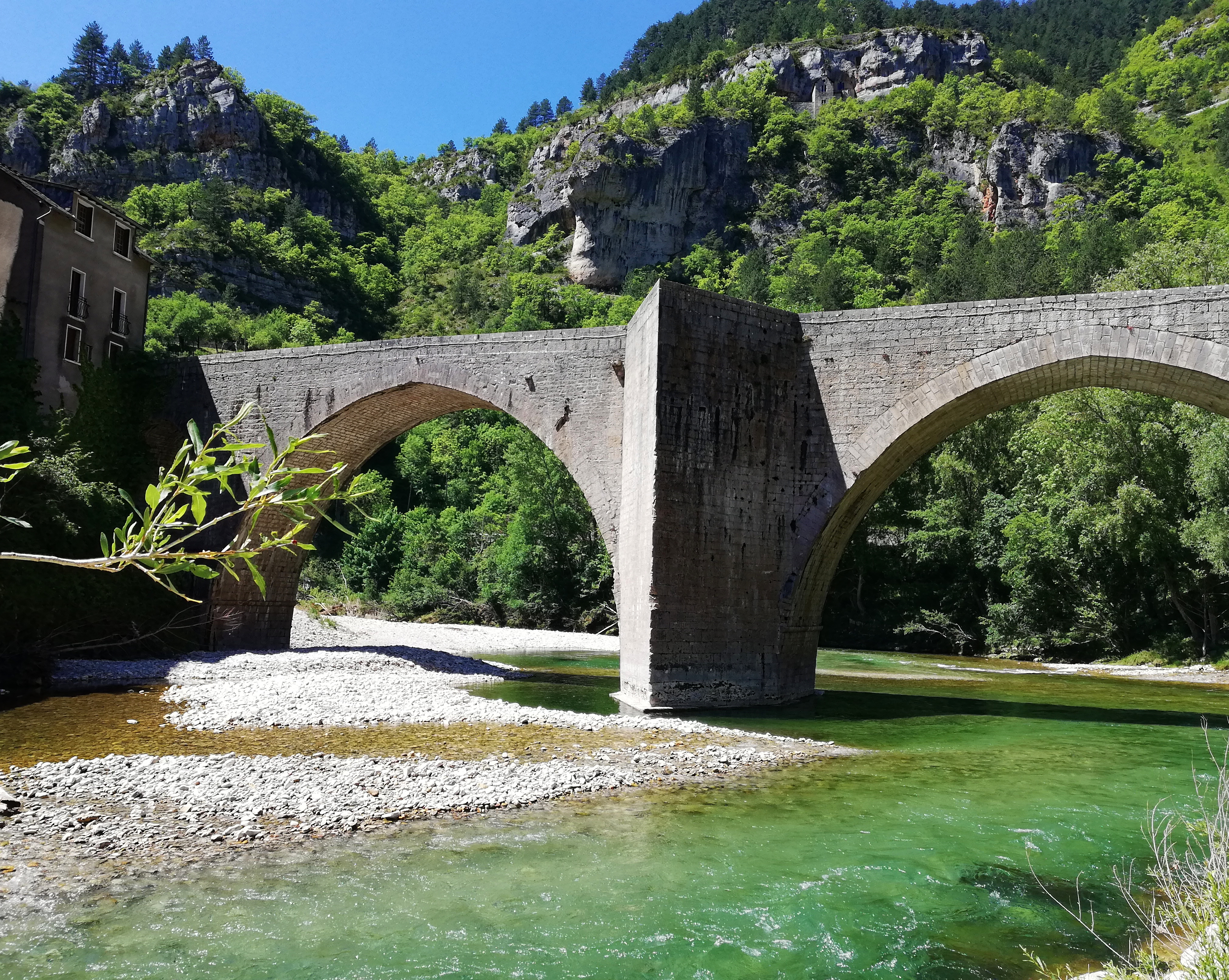 Incontournable visite. L’arrivée est magistrale, par le pont qui surplombe une eau couleur de bijou, jusqu’au village enclavé dans la verdure et les fleurs (au printemps, hein…). Cherchez la chapelle troglodyte 😉