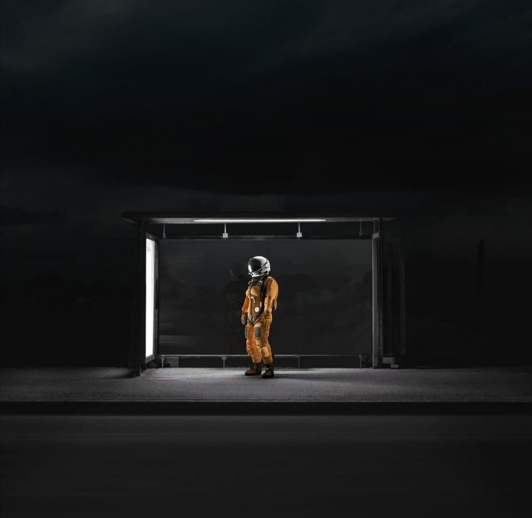 C’est je que je pense en m’acheminant vers l’îlot de lumière qui forme autours du banc de plastique abîmé une aura claire. Je suis toujours en avance pour le dernier bus, ça me donne l’illusion d’être en avance sur la journée qui va suivre. Mais ce soir, quelqu’un m’a devancée. Une silhouette épaisse, colorée, surmontée d’un bocal. Le doute n’est pas permis: il y a un cosmonaute dans mon abribus. Il attend là, les bras ballants, le regard perdu. Le genre de type dans la lune, qui oublie sa valise pour partir en vacances. Ou qui veut adopter le point de vue de son poisson rouge. Comme je m’installe sur le banc, il se tourne vers moi avec la lenteur que lu impose son équipement.
